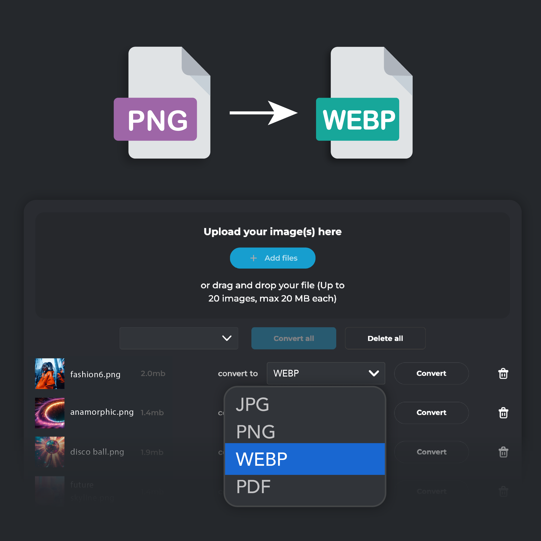 Convert your PNG files to WebP effortlessly for faster websites and better image management. Ideal for developers and designers needing a quick, free solution to optimize visuals.