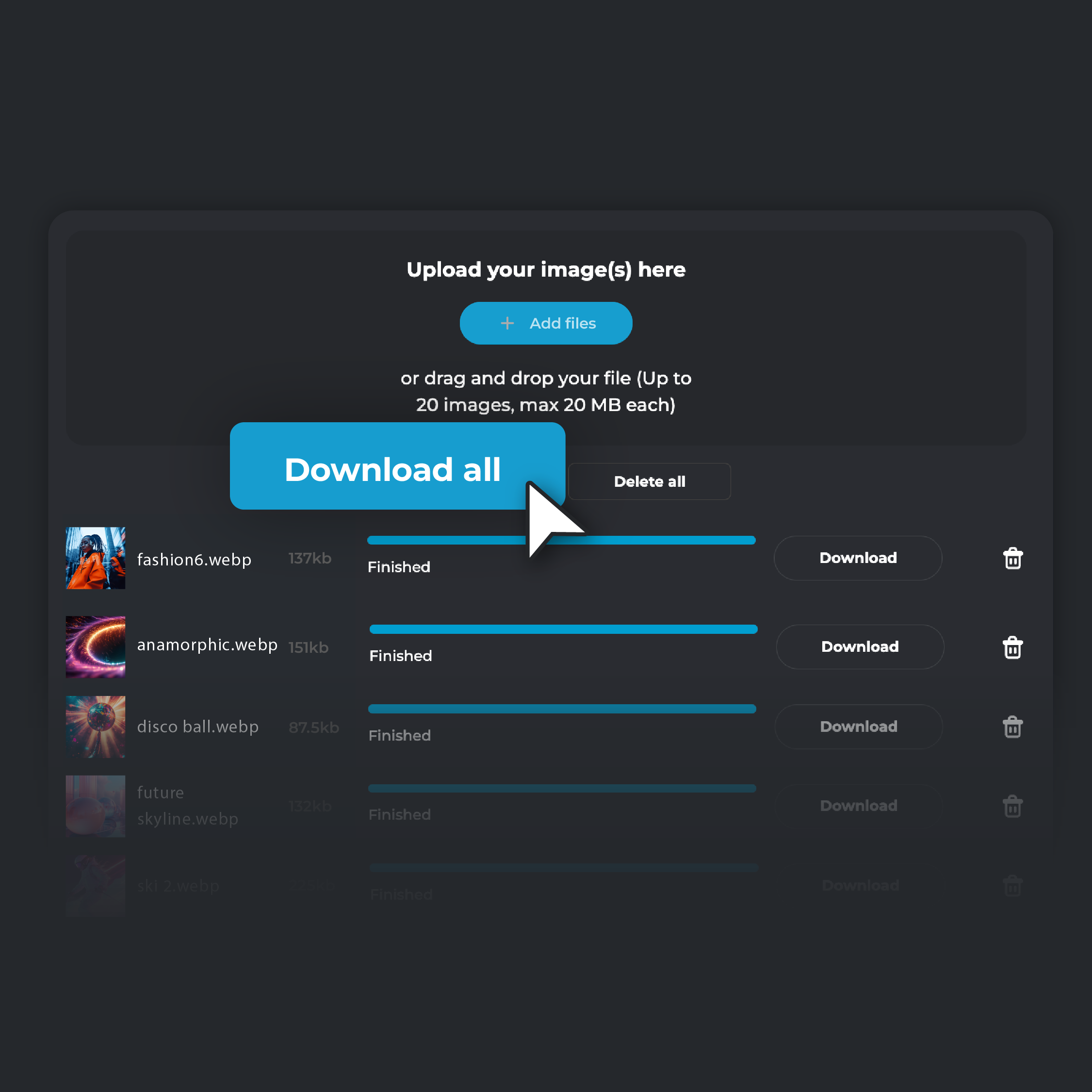 Streamline your image conversion process by converting multiple PNG files to WebP at once. Pixlr’s batch conversion feature makes it easy to handle large image libraries quickly, saving you time and ensuring consistency across all your web projects. This is an ideal solution for web developers and designers looking to optimize their images quickly and efficiently